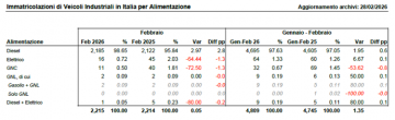 Significativo, invece, per quanto riguarda le alimentazioni, il ritorno del segno positivo nel diesel, che guadagna il 2,97 nel mese (quota di mercato 98,65%) e l’1,95 nel bimestre dopo un 2025 in perdita netta (-4,85%) e un gennaio in leggero calo (-0,32%). In parallelo crolla l’elettrico, che partendo da numeri marginali è fortemente sensibile a qualunque variazione e, dunque, i 16 veicoli immatricolati in febbraio segnano una diminuzione del 64,44% nel mese e pareggia il risultato nel bimestre, annullando la leggera crescita di gennaio. Il metano conferma la sua progressiva e costante marginalizzazione. Altrettanto significativo il calo delle immatricolazioni nei pesi più leggeri, fino alle 16 tonnellate (-15,54% da 3,5 a 7,5 tonnellate e -31,05 da 7,5, a 16 tonnellate), dove la presenza dell’elettrico è generalmente più forte e l’incremento del 5,56% sopra le 16 tonnellate, dove il ricorso al diesel è pressoché totale.